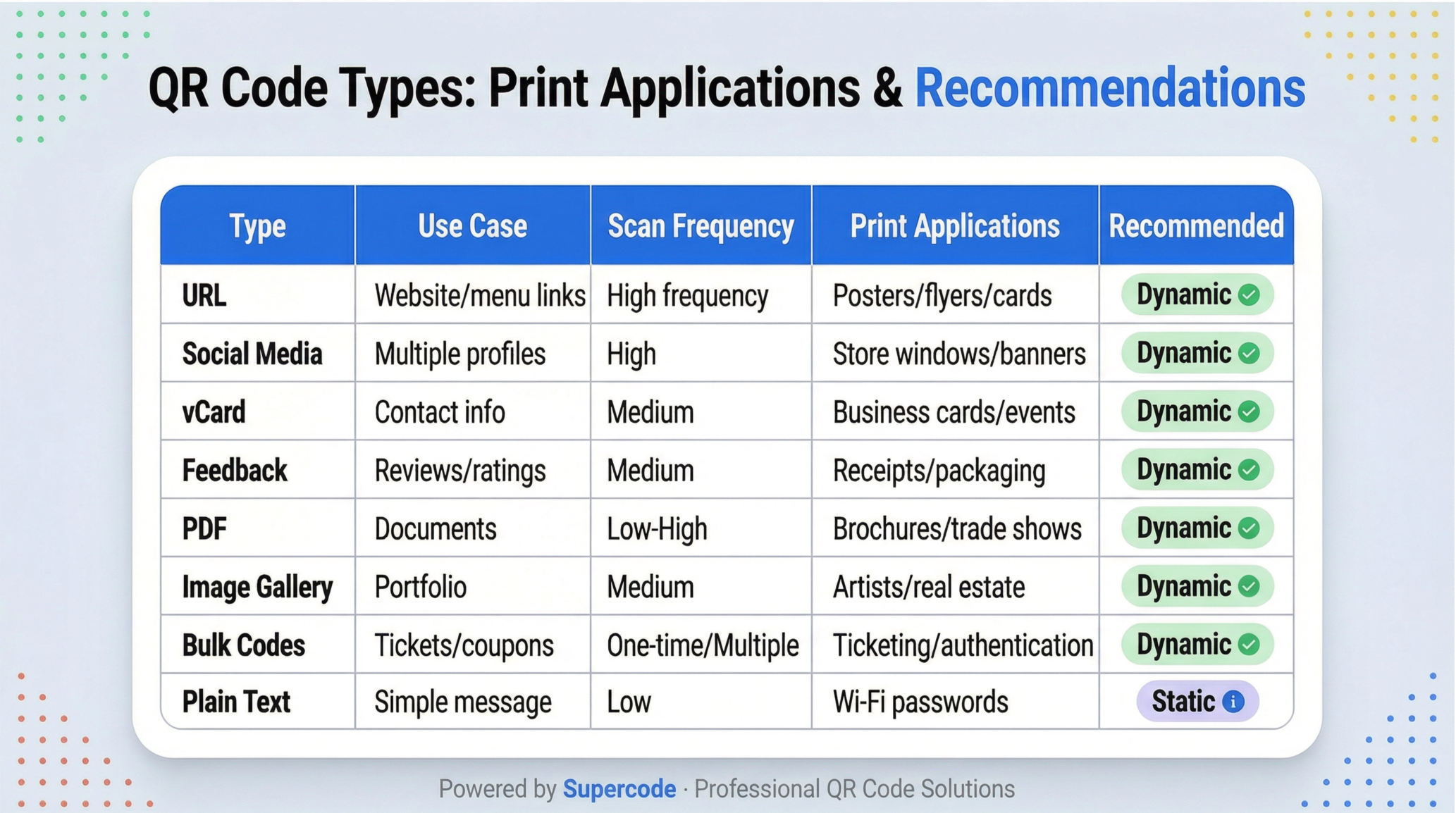 To help you decide which specific QR code type best suits your printing needs, the following table provides a comparison of common use cases and their recommended code types.