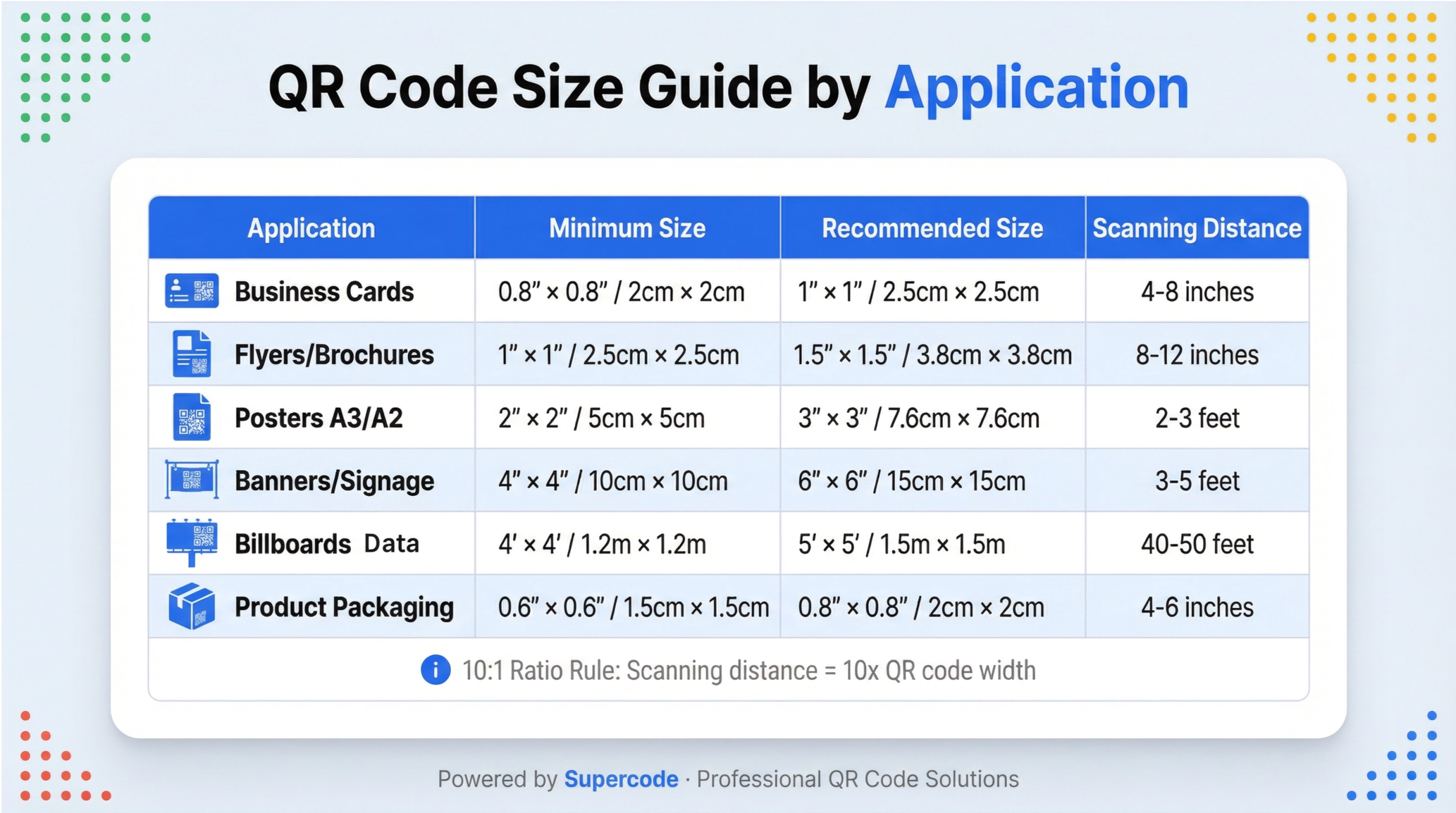 One of the most frequently asked questions about QR code printing is, "How big does it need to be?" The answer depends entirely on the scanning distance. A QR code on a business card will have very different size requirements than one on a billboard. A simple rule of thumb is the 10:1 ratio.