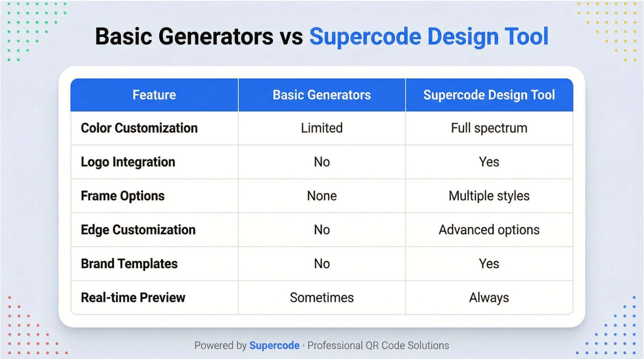 While there are many free QR code generators available online, they often lack the advanced design features and customization options needed to create a truly professional and on-brand QR code. For businesses and marketers who are serious about leveraging the full potential of QR codes, a dedicated design tool like Supercode is a worthwhile investment. The table below compares the design features of basic generators with the Supercode design tool.