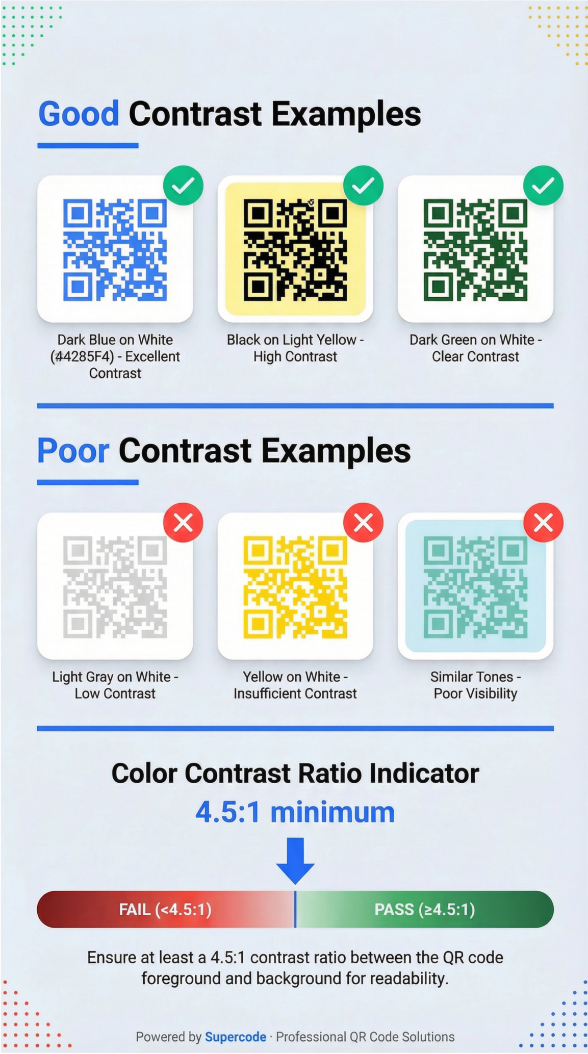 To ensure broad scannability across various devices and lighting conditions, a minimum contrast ratio of 4.5:1 is recommended between the foreground and background colors. This ratio is a standard for web accessibility and ensures that your QR code is readable for the vast majority of users and scanning applications.
