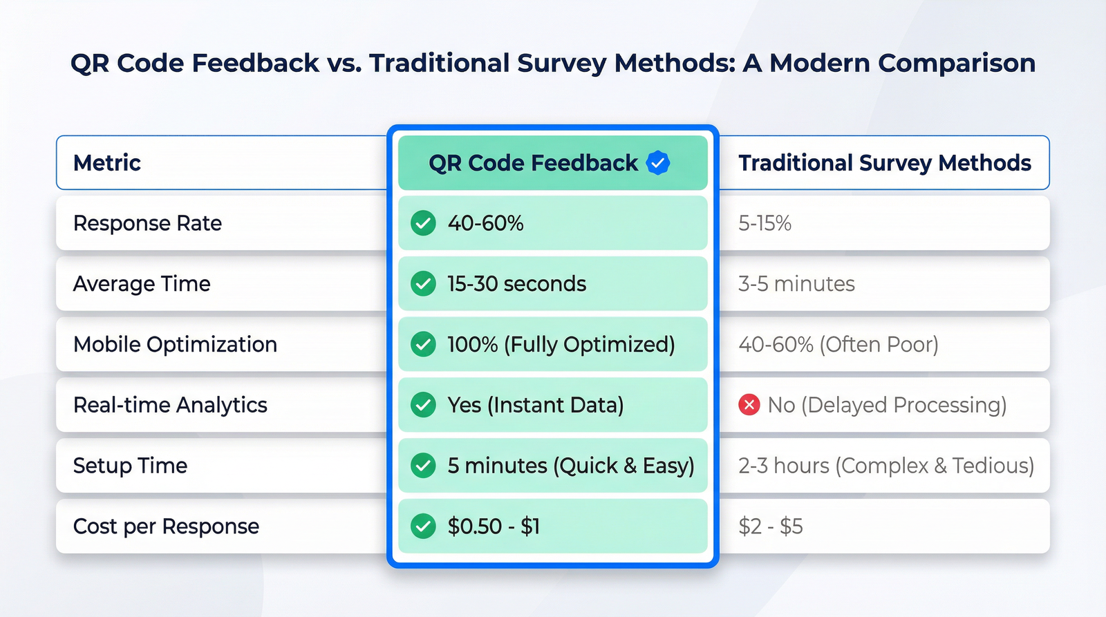 QR Codes: 40-60% response rate, takes 15-30 seconds to complete, instant access from physical location, 100% mobile optimized, real-time analytics, zero friction