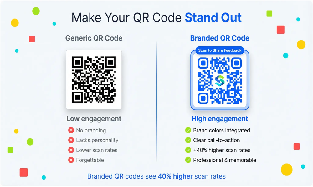 Call-to-Action Text: Include text like "Scan to share feedback," "Tell us what you think," or "Quick survey — 15 seconds." This text dramatically increases scan rates by clarifying the benefit.